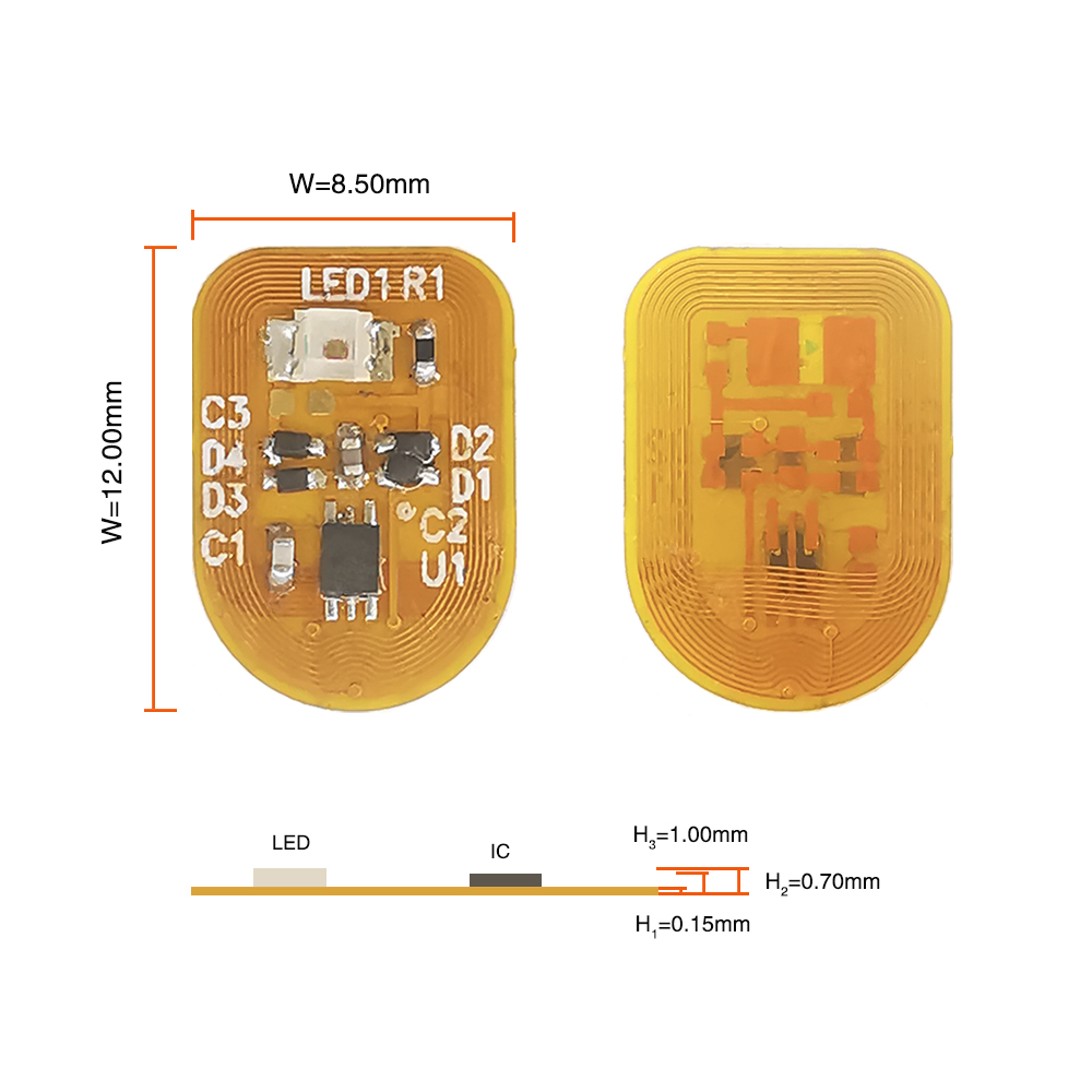:超薄设计模仿指甲贴大小,嵌入ST25TA02KB-D芯片 (ISO 14443A) 用于非接触式访问/支付。靠近 NFC 读卡器/智能手机时触发七彩LED渐变,将科技与时尚融为一体。柔性 FPC 基材确保日常佩戴的舒适性和耐用性。非常适合安全身份验证、无现金交易或交互式美容技术应用程序。将加密数据交换与视觉反馈相结合,为活动、零售忠诚度或个性化数字身份启用 NFC 钉子。
